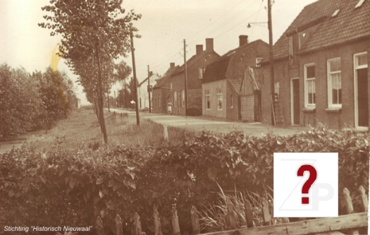 Links de eenkamerwoningen die waarschijnlijk na de grote overstroming van 1861 zijn gbouwd en rechts de beruchte Vlaas waarin de loop der jaren kinderen zijn verdronken. In het eerste huis woonde Gerrit van der Stam dan Jan Hendrik van Maren en Teunis van Hemert, allen fabrieksarbeiders. Het volgende huis was van A. Rijken daarnaast woonde visser Chr. Biebers en bomenrooier Gijs van Hemert. Links op de foto staan Hendrik Timmer Czn., Elias Timmer Czn. en Govertje van Maren-Verbeek de vrouw van Jan Hendrik van Maren (de eerste vrouw links). In het midden van het groepje staat met berenmuts G.J. van Andel-Timmer. Het hoge gebouw op de achtergrond is de openbare lagere school aan de Waalbandijk.