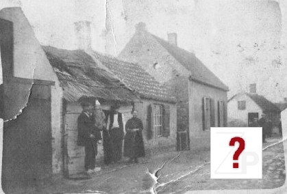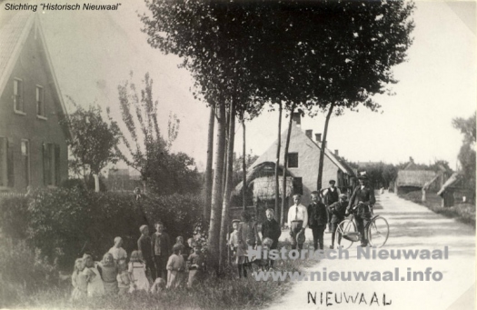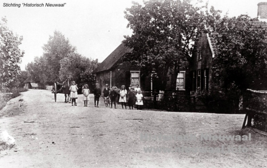 Boerenhuis met rieten dak van fam. J.G. van Steenbergen (afgebrand in 1935). In het andere huis woonde marius van Hemert (later vertrokken naar Zaltbommel). Met stortkar Pauw Maas, daarvoor Fieke van Hemert-Verhoeks en over haar schouder kijkt mee Adriaan van Steenbergen op de achtergrond Jaantje Lambermon dan Willie van hemert (Mariusdr.), Piet van Mourik, dan met strikje een vertegenwoordiger van de firma van Dijk (joodse familie) uit Zaltbommel. Met hond Arie Verhoeks dan Jeneke Willemina (Jetje) van Hemert (Mariusdr.), Jo van Mourik, Pietje van Eck-van Maren daar achter links Wim van Steenbergen-Bok en Mereke Alida van Eck de vrouw van Marius van Hemert afkomstig uit Delwijnen.