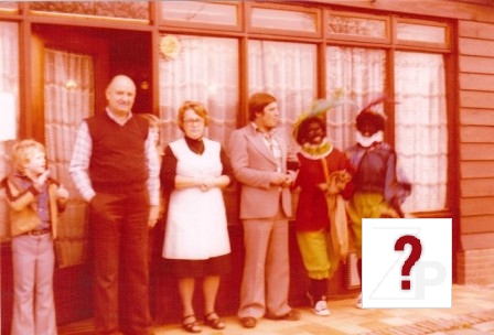 Rinie van Brakel, Jo, daar achter Nico van Brakel, Marie, Arie Verhoeks met de twee zwartepieten Gijsje Baijense en Sia van Heusden.