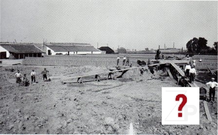 De arbeiders zijn bezig met het kruien van klei naar de voormaler waar de klei wordt verwerkt tot een steen. Daar achter is het tastveld waar de stenen worden afgeslagen om te drogen. Voldoende gedroogd, werden ze opgestapeld om door zon en wind verder te drogen, waarna ze in het winterseizoen in de veldoven, gestookt met kolen en turf, werden gebakken. Rechts naast de gebouwen ziet u de turfbult.