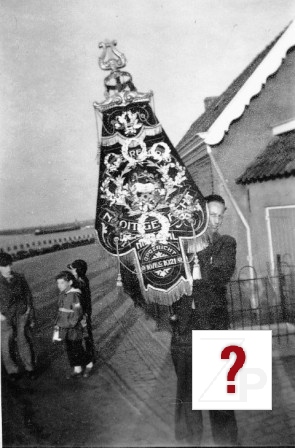 Leen van Wijgerden met het vaandel van muziekvereniging Nooit Gedacht uit Nieuwaal opgericht 10 augustus 1921.