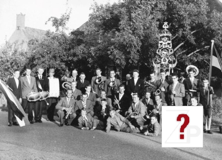 Kees Termeer, Jan van Wijk, Marius van Hemert (Moske), Hen van Maren jr., Kees Ekelmans Czn, dirigent Moors, Hannes van Hemert, Jac van Hemert, Toon Ekelmans en Ruth Schreuders.