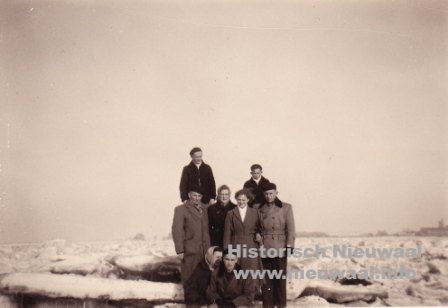 IJspret op de ondergelopen uiterwaard met tweede van links Dries van Steenbergen, derde van links Jan van Wijgerden en derde van rechts Arwie van Hemert. Rechts Coby van Pouderoijen en Hannie van Steenbergen.