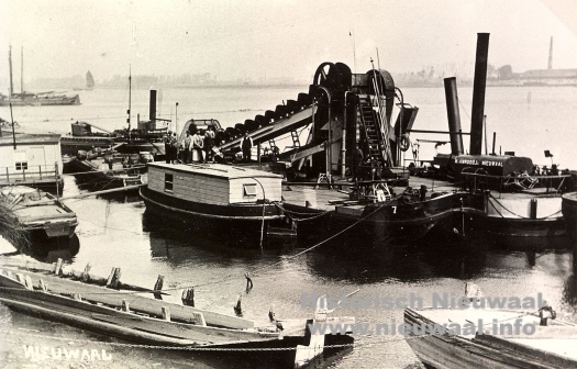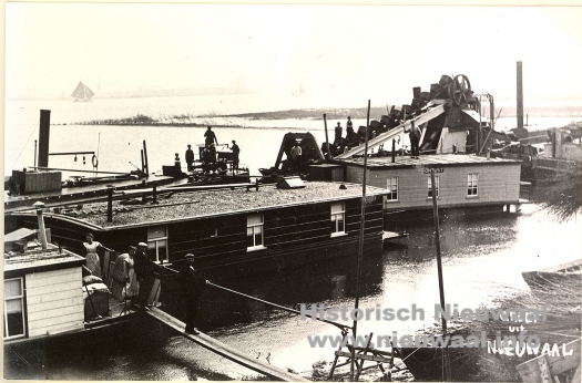 Baggerschip en woonarken voor de zgn. buitenafwerkers van de firma van Anrooij.
