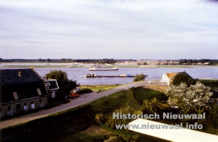Zicht vanaf de Waalbandijk op de waal met de schepen en baggerschuit van H. van Anrooij.