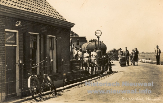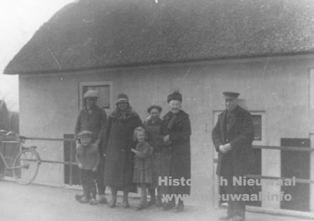 Links het schippershuis van firma Baggerman verder staan v.l.n.r; chauffeur van de tankauto, Gijsbert van Rumpt, Neeltje Timmer, Adriana Baggerman, Goos van Pouderoijen met zijn dochters.
